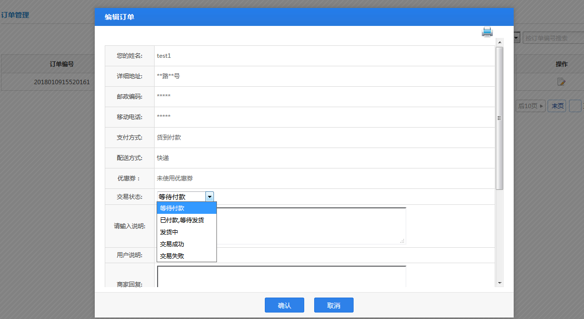 查看并编辑订单状态功能,后台无法删除订单,只有前台会员可以删除状态为交易失败的订单。